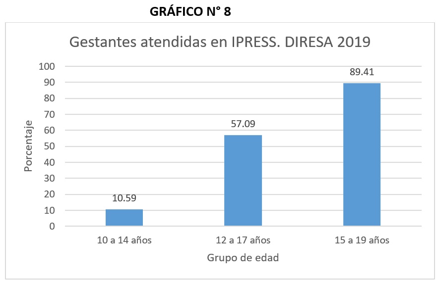 Según el HIS de DIRESA, en el 2019 hubieron 5,458 gestantes atendidas entre 10 y 19 años, de los cuales el 10.59 fueron menores de 14 años, el 57.09 % fueron de 12 a 17 años.