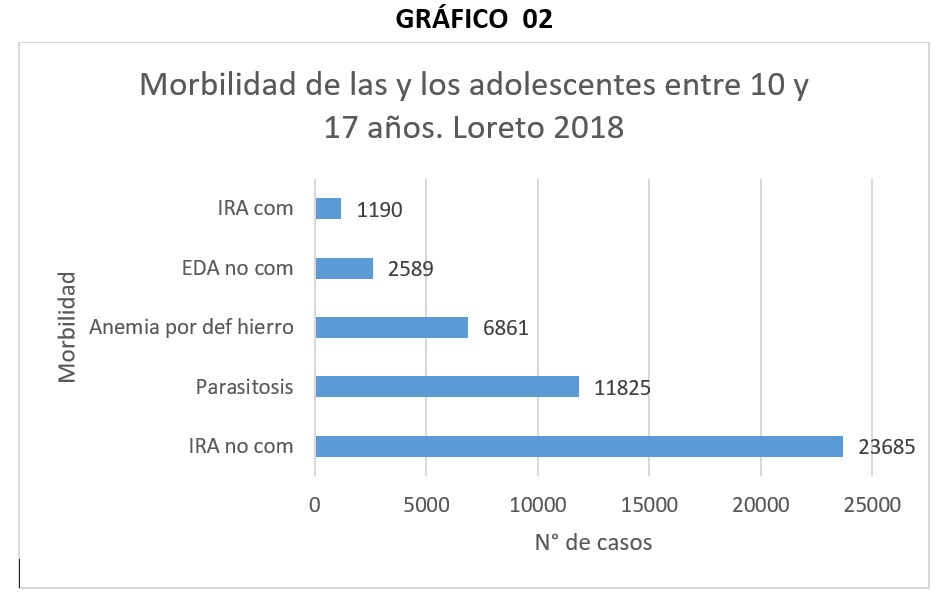 En Loreto, en el año 2018; la principal causa de morbilidad en adolescentes entre 10 a 17 años, fueron las Infecciones Respiratorias Agudas no complicadas, siendo un total de 23 mil 685 casos los que se reportaron, seguido de Parasitosis Intestinal con 11 mil 825 casos y Anemia por deficiencia de hierro con 6 mil 861 casos (Gráfico N° 02).