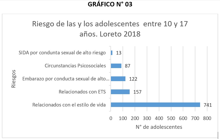 En Loreto, en el año 2018, la principal causa de riesgos del adolescente entre 10 a 17 años están referidos a: Otros problemas relacionados con el estilo de vida como: malos hábitos de alimentación, sedentarismo, trastornos de sueños, entre otros siendo reportados 741 casos; le sigue el riesgo de contraer una ETS por conducta sexual de alto riesgo (157 casos) y en tercer lugar el riesgo de embarazo por conducta sexual de alto riesgo, 122 casos reportados (Gráfico N° 03).