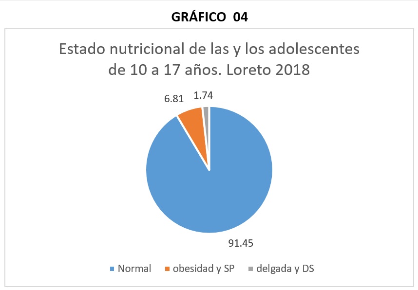 En Loreto; 20,196 adolescentes tienen un estado nutricional adecuado para su edad (normal); sin embargo, tenemos 1,244 adolescentes con sobrepeso y 259 con obesidad corporal, constituyéndose un problema de salud en este grupo poblacional. Así mismo observamos que, 737 adolescentes están con talla baja para su edad. (Gráfico 04).