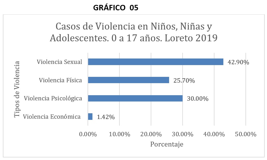 Según los reportes del año 2019 de los Centro de Emergencia Mujer en la región Loreto, se puede observar que la violencia que más se reporta en NNA, es la violencia sexual; seguida por la violencia psicológica; física; y en un menor porcentaje la violencia económica o patrimonial.