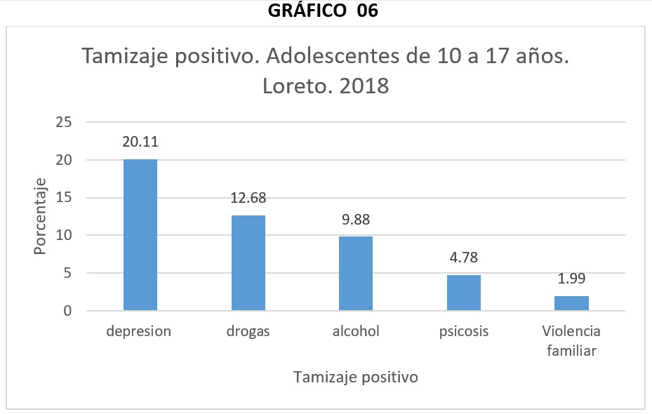 Es importante resaltar que en el año 2019 la DIRESA realiza tamizaje a las y los adolescentes que acudieron al establecimiento, del total de tamizajes depresión resultó el problema de salud mental más alto (20.11 %), seguido de consumo de drogas (12.68%). Es importante resaltar que el 4.78 % presentaron el diagnostico de pcosis.