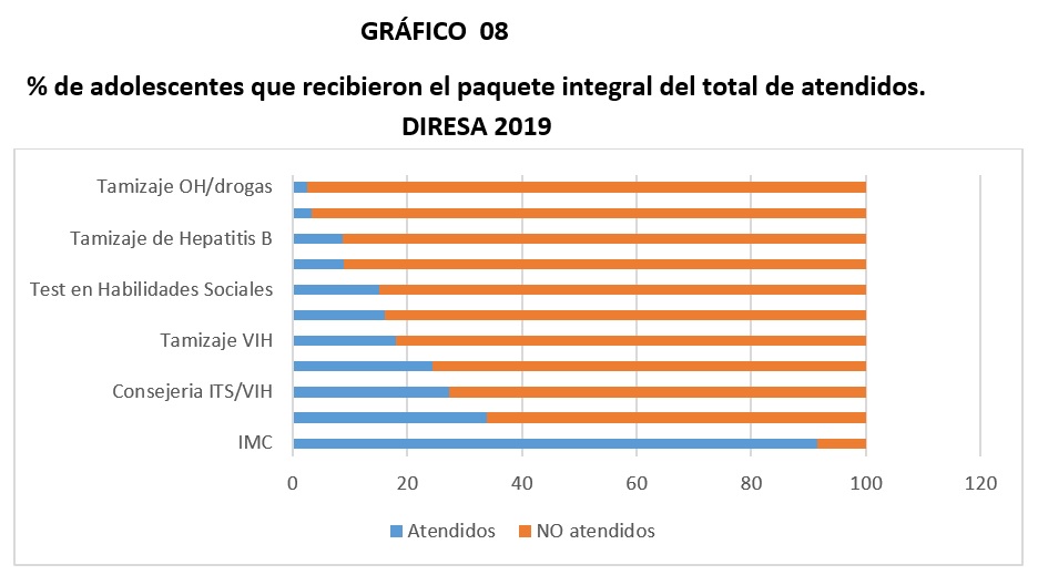 Según el reporte HIS, en Loreto en el 2019 se atendieron en los establecimientos de la DIRESA 49,443 adolescentes (36%). Del total de atendidos iniciaron un plan de atención el 20.6 %, de los cuales solo finalizaron el 9.4 %. Grafico 7